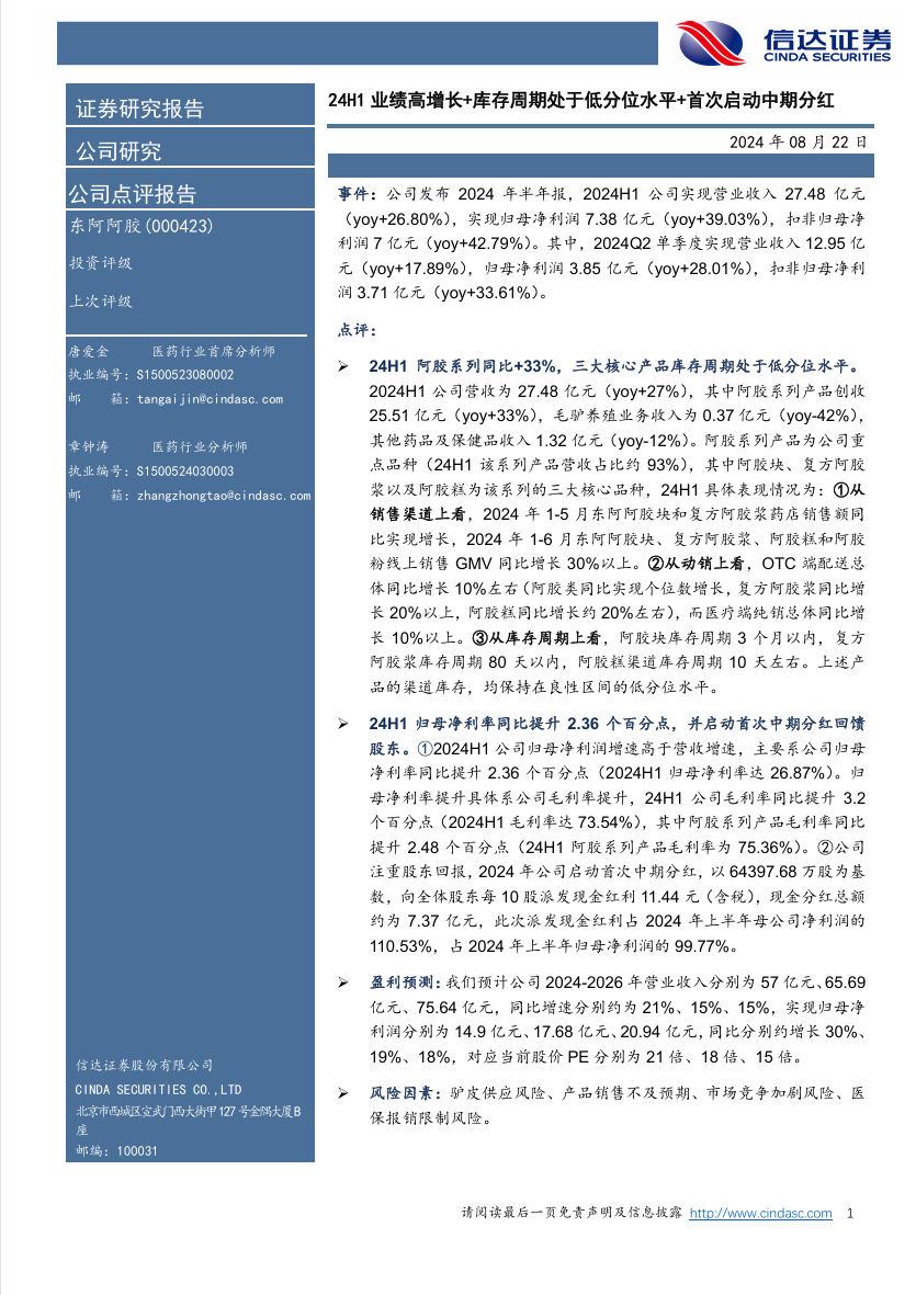【信达医药】东阿阿胶(000423)2024H1点评报告:24H1业绩高增长+库存周期处于低分位水平+首次启动中期分红