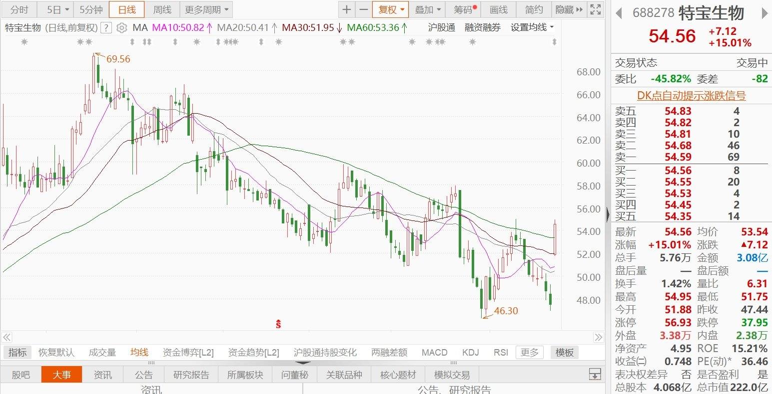 特宝生物(688278.SH)大涨超15%,报54.56元,总市值222亿元。特宝生物发布半年报,公司2024年上半年实现营业收入11.90亿元,同比增长31.68%;实现归母净利润3.04亿元,同比增长50.53%。