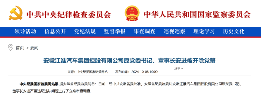 据安徽省纪委监委10月8日消息,安徽江淮汽车集团控股有限公司原党委书记、董事长安进被开除党籍,其涉嫌犯罪问题移送检察机关依法审查起诉,所涉财物一并移送。