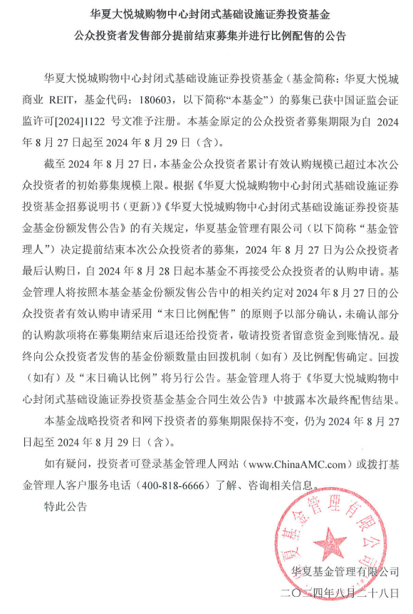 据悉,华夏大悦城商业REIT原定的公众投资者募集期限为自2024年8月27日起至2024年8月29日(含)。截至2024年8月27日,本基金公众投资者累计有效认购规模已超过本次公众投资者的初始募集规模上限。根据基金招募说明书和基金份额发售公告的有关规定,华夏基金决定提前结束公众投资者的募集,2024年8月27日为公众投资者最后认购日,自2024年8月28日起本基金不再接受公众投资者的认购申请。