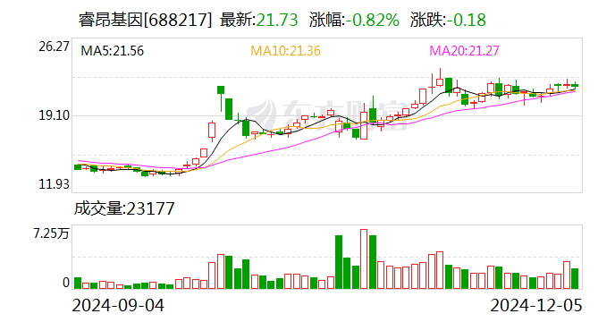 截至12月5日收盘,睿昂基因报21.73元/股,总市值12.14亿元。