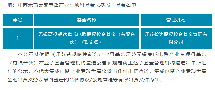 投资界(ID:pedaily2012)消息,据锡创投发布,无锡市战新产业专项母基金拟参股子基金通过江苏省战略性新兴产业母基金决策。拟参股子基金为无锡高投毅达集成电路股权投资基金,管理机构为江苏毅达股权投资基金管理有限公司。