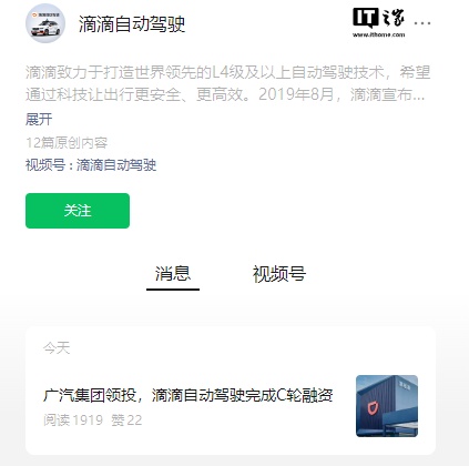 IT之家 10 月 22 日消息,滴滴自动驾驶今日发文称,公司近日完成 C 轮 2.98 亿美元融资,本轮融资由广汽集团领投,滴滴参与。