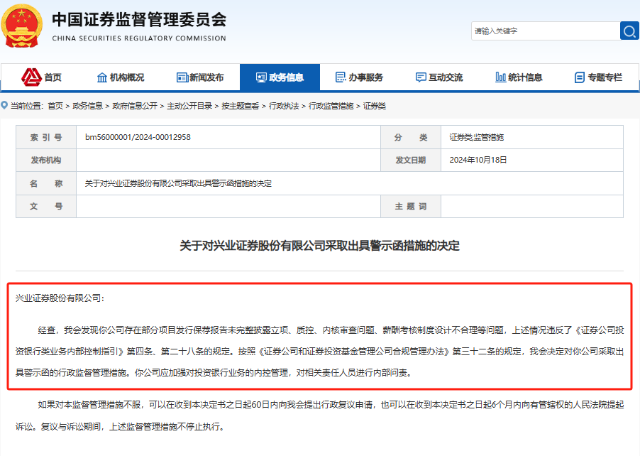 2024年10月18日,中国证监会公开披露了《关于对兴业证券股份有限公司采取出具警示函措施的决定》。