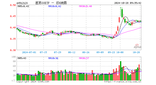 10月28日,医药50ETF(512120)开盘涨0.23%,报0.429元。医药50ETF(512120)重仓股方面,恒瑞医药开盘涨0.06%,药明康德跌0.06%,片仔癀涨0.13%,云南白药跌0.21%,上海莱士涨0.00%,新和成涨0.52%,智飞生物跌6.63%,泰格医药涨0.08%,科伦药业涨0.03%,长春高新跌0.06%。