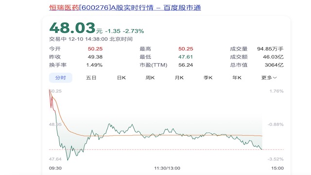 12月10日上午,恒瑞医药A股盘中股价一度跌幅超过3%,截至下午两点半左右,股价跌幅依旧超过2%。