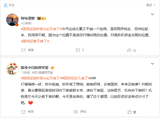 据悉,9月30日,国信证券旗下金太阳App曾由于单太大导致交易软件崩溃,微博网友纷纷发布交易软件截图,表示要“索赔”。