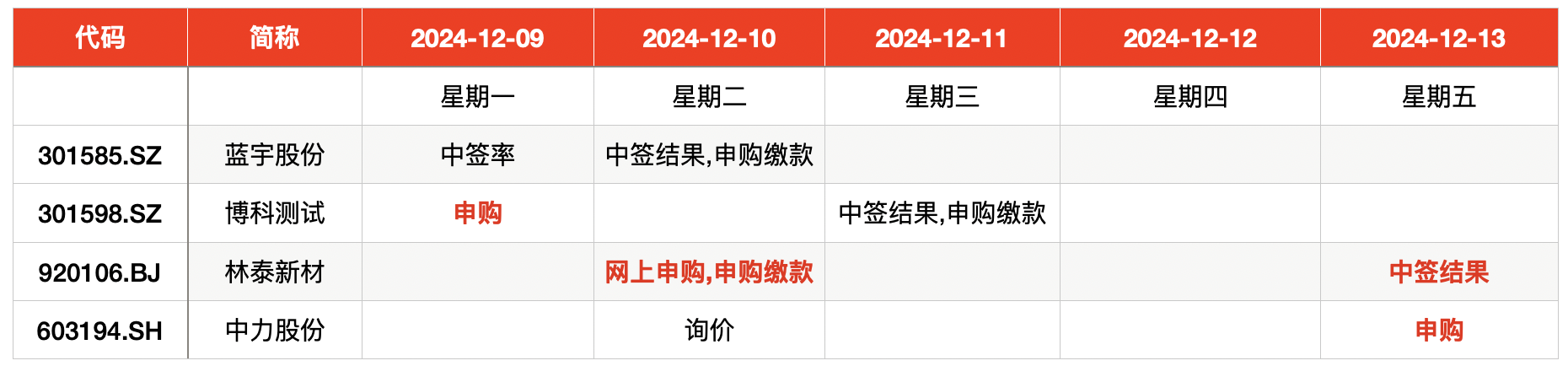 本周一,博科测试开启申购;林泰新材、中力股份则分别在本周二、本周四申购。