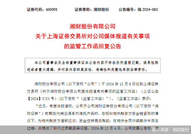 具体来看,《监管工作函》表示,有媒体报道称,公司子公司湘财证券前期在代销云涌系列信托产品时,在明知相关融资方资金链紧张的情况下,为相关融资方借新还旧、资金空转提供帮助,在相关合同诈骗案件中存在过错,并提供了聊天记录截图等证据。2024年12月4日,公司披露公告称,湘财证券收到民事判决书,需对广东中诚实业控股有限公司对云南国际信托有限公司(以下简称“云南信托”)约3.4亿元的支付义务承担约56%的补充责任。鉴于上述事项对公司及投资者利益影响较大,市场关注度较高,上交所所向公司下发《监管工作函》,要求对相关事项进一步说明和披露。