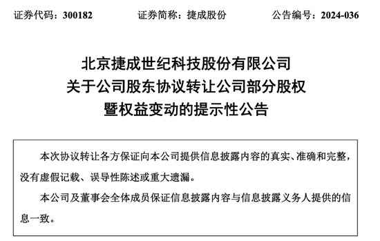 捷成股份表示,本次协议转让事项不会对公司治理结构及持续经营产生重大影响。本次股权转让需深圳证券交易所进行合规性确认后方能在中国证券登记结算有限责任公司深圳分公司办理流通股协议转让过户手续。本交易最终是否能够完成尚存在不确定性。