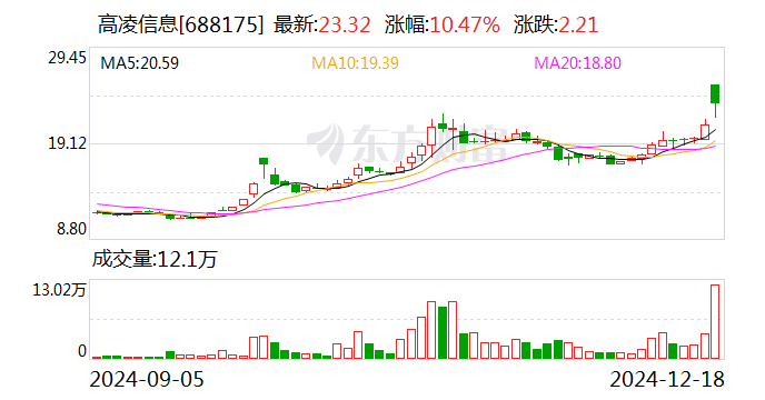 12月18日,高凌信息(688175.SH)开盘即涨停,截至午间收盘,收报每股23.41元,上涨10.90%,成交金额2.56亿元。