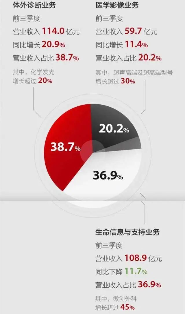 IVD、医学影像国内都有双位数增长,之所以前三季度增速只有1.9%,原因想必大家也发现了,是的,就是生命信息与支持产线比较拉垮,前三季度这块业务在国内的下滑幅度超过20%,但即便如此也是跑赢大盘的,市占率依然有所提高。