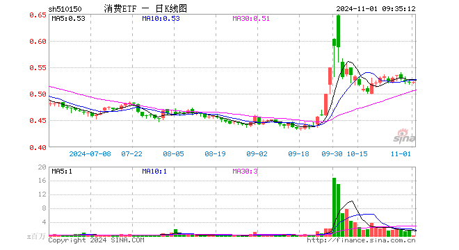 11月1日,消费ETF(510150)开盘跌0.19%,报0.521元。消费ETF(510150)重仓股方面,贵州茅台开盘跌0.44%,恒瑞医药涨0.26%,伊利股份跌0.50%,海尔智家涨0.14%,药明康德跌0.58%,山西汾酒涨0.32%,福耀玻璃涨0.28%,海天味业涨0.02%,片仔癀涨0.00%,上汽集团跌0.16%。
