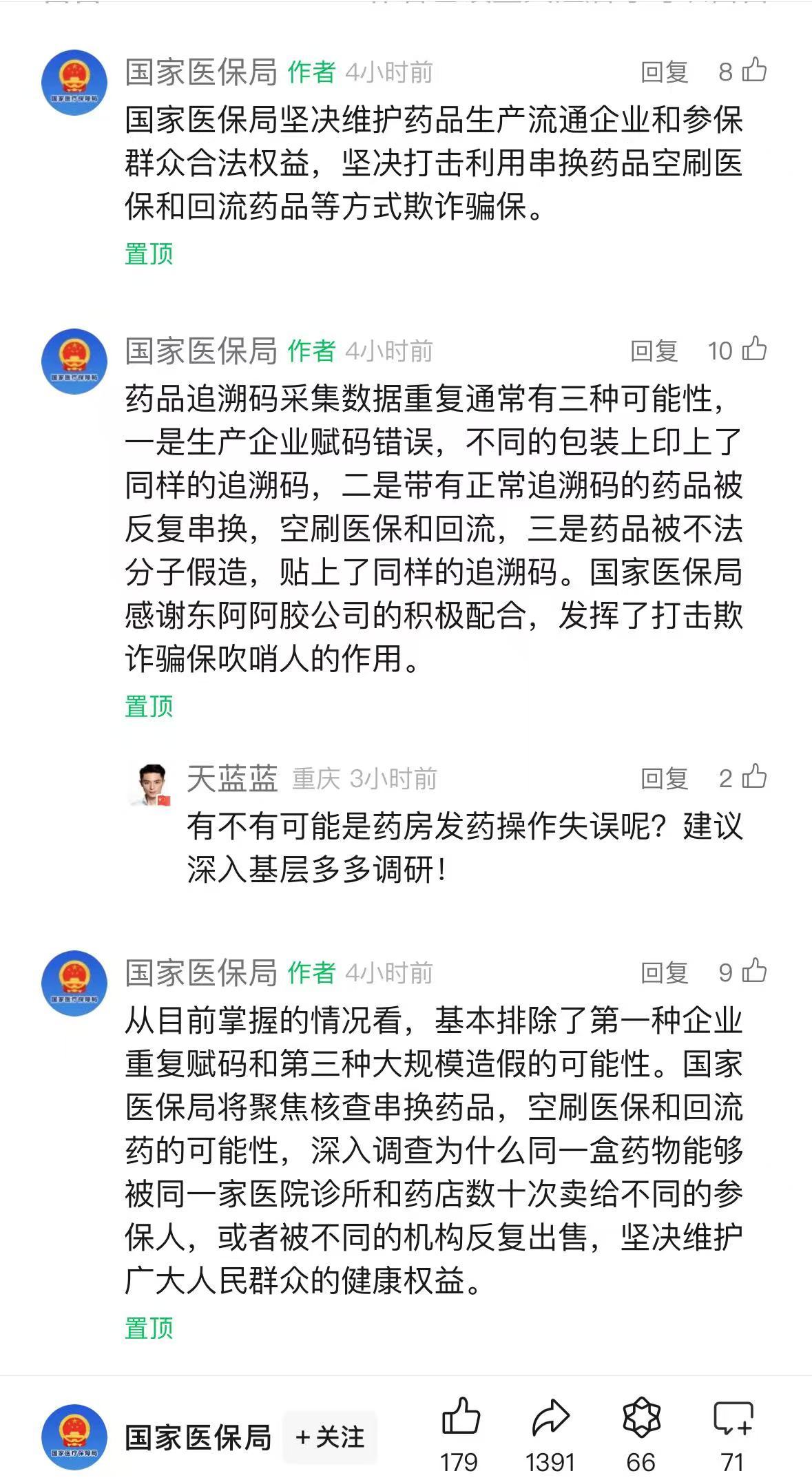 11月3日晚,国家医保局微信公众号在转载《东阿阿胶关于积极响应国家医保局有关公告的声明》的评论区置顶表示:国家医保局坚决维护药品生产流通企业和参保群众合法权益,坚决打击利用串换药品空刷医保和回流药品等方式欺诈骗保。药品追溯码采集数据重复通常有三种可能性,