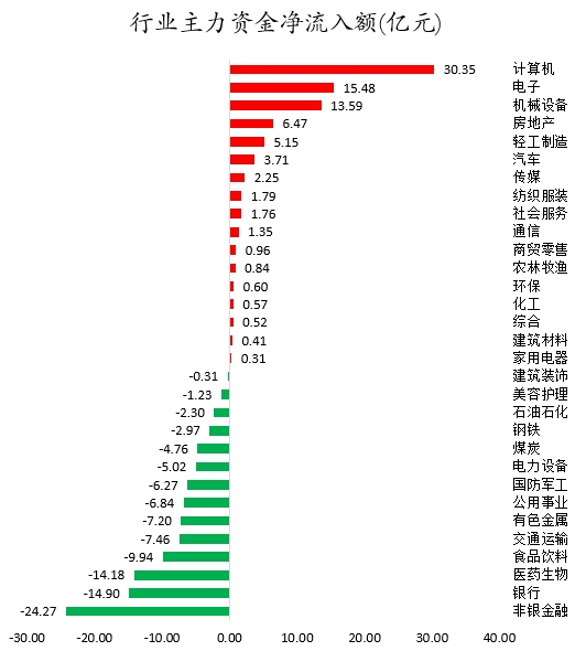 从行业板块来看,申万所属的31个一级行业,今日有17个行业板块主力资金呈现净流入,其中,计算机行业板块主力资金净流入最多,净流入金额为30.35亿元;行业板块主力资金净流入居前的还有电子、机械设备、房地产、轻工制造、汽车,净流入金额分别为15.48亿元、13.59亿元、6.47亿元、5.15亿元、3.71亿元。14个行业板块主力资金呈现净流出,其中,非银金融行业板块主力资金净流出最多,净流出金额为24.27亿元;行业板块主力资金净流出靠前的还有银行、医药生物,净流出金额分别为14.9亿元、14.18亿元。