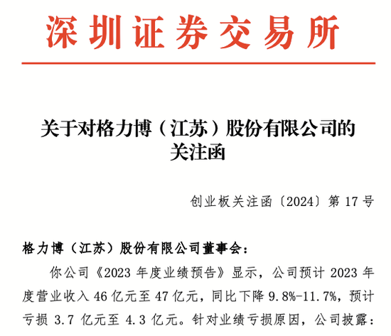 2024年1月31日,格力博发布业绩预告表示,公司预计2023年营业收入为46亿元至47亿元,同期下降9.8%至11.7%;预计归母净利润为亏损3.7亿元至4.3亿元,同比下降239.1%至261.7%;预计扣非净利润为亏损3亿元至3.6亿元,同比下降235.7%至262.9%。