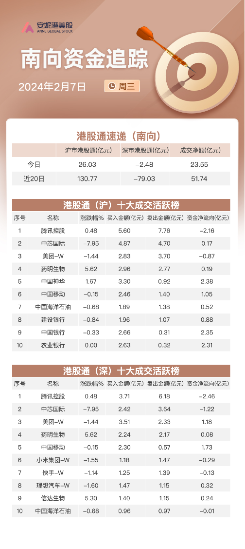 南向资金2月7日净买入超23亿港元:大幅加仓中移动 抛售腾讯及中芯国际
