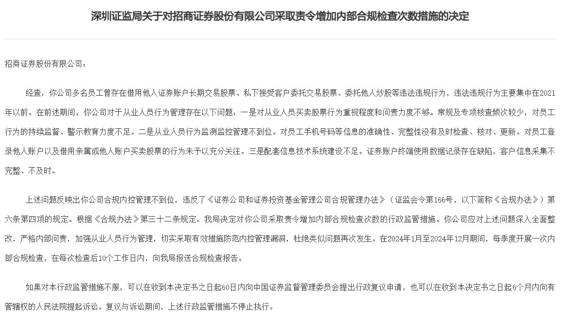 招商证券被要求增加合规检查次数:多员工存委托他人炒股等行为