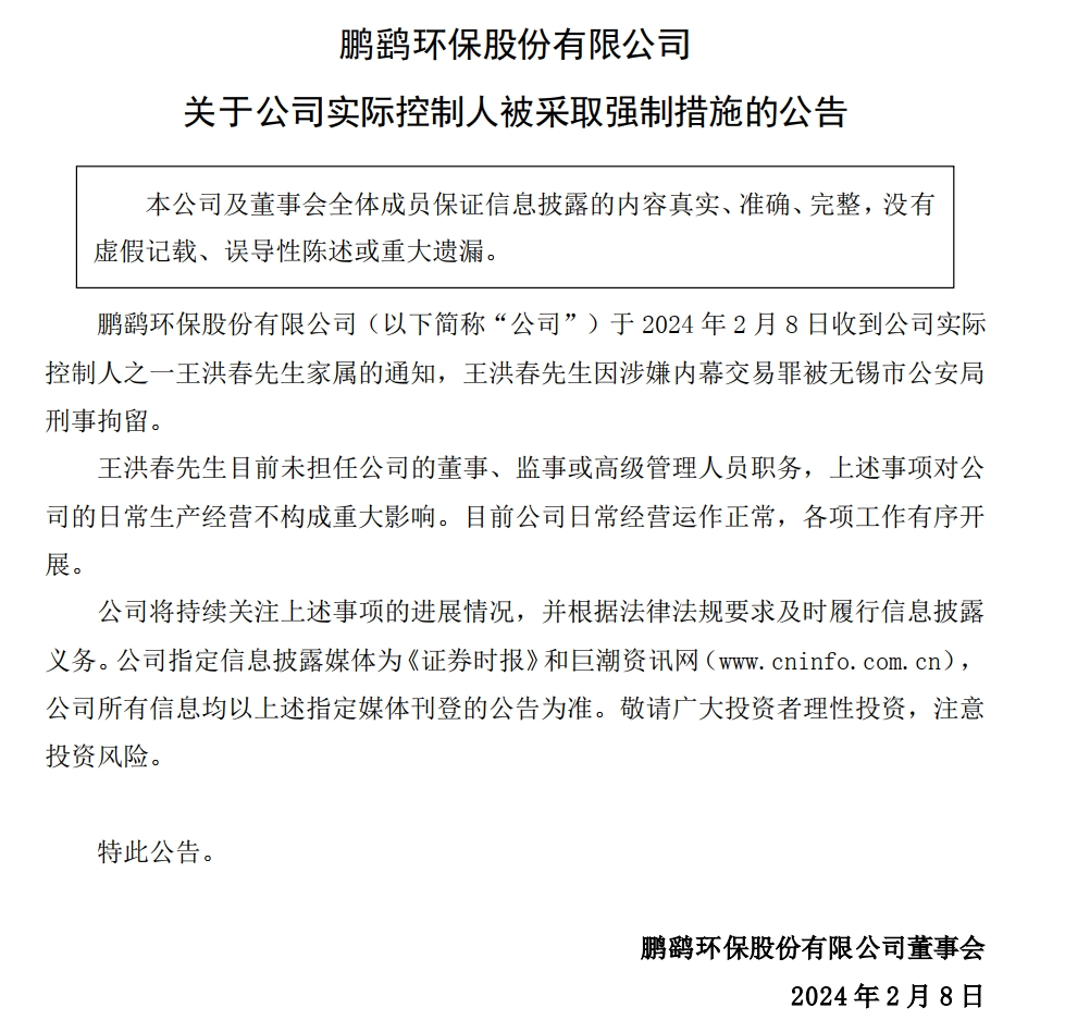 2月8日晚间,鹏鹞环保4,股价4.65元,市值36.85亿元)发布关于公司实际控制人被采取强制措施的公告称,公司于2024年2月8日收到公司实际控制人之一王洪春家属的通知,王洪春因涉嫌内幕交易罪被无锡市公安局刑事拘留。