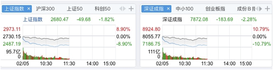 A股主要指数继续调整。2月5日早盘,沪指一度跌至2635.09点,创2019年2月以来新低。截至午间收盘,沪指跌1.82%,深证成指跌2.28%,创业板指跌1.7%。