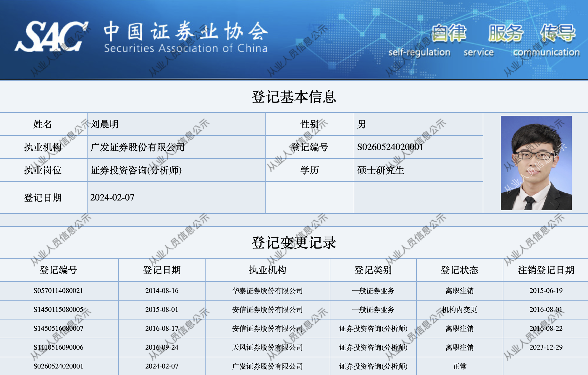 证券业协会官网资料显示,刘晨明的从业资格登记已于2月7日变更至广发证券,登记类别为证券投资咨询(分析师)。