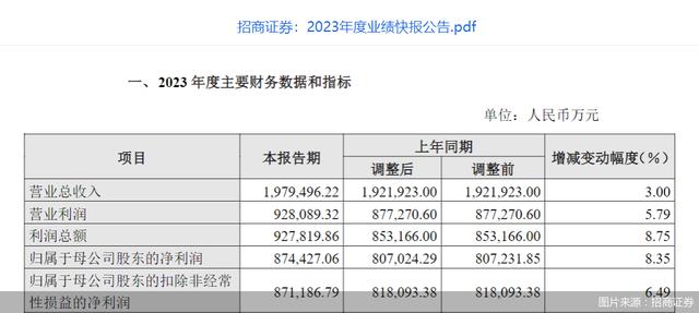 招商证券2023年业绩快报:归母净利润87.44亿元 同比增长8.35%