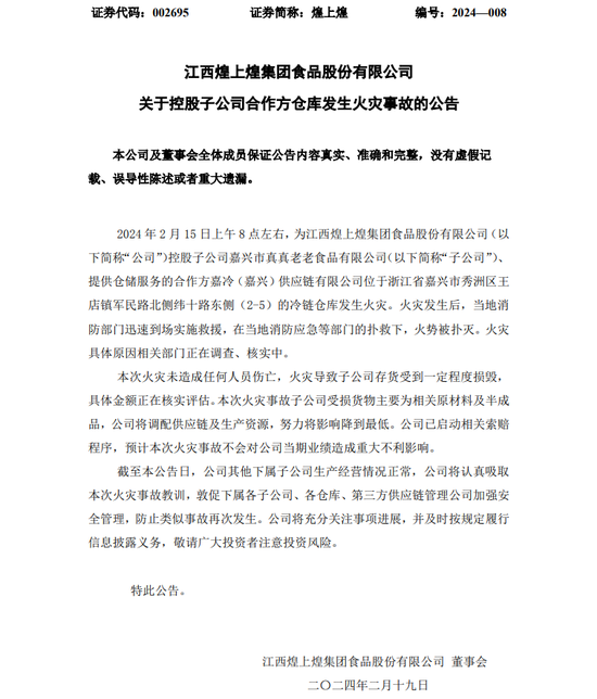 煌上煌2月18日晚间公告,2024年2月15日上午8点左右,为江西煌上煌集团食品股份有限公司控股子公司嘉兴市真真老老食品有限公司、提供仓储服务的合作方嘉冷供应链有限公司位于浙江省嘉兴市秀洲区王店镇军民路北侧纬十路东侧的冷链仓库发生火灾。本次火灾未造成任何人员伤亡,火灾导致子公司存货受到一定程度损毁,具体金额正在核实评估。