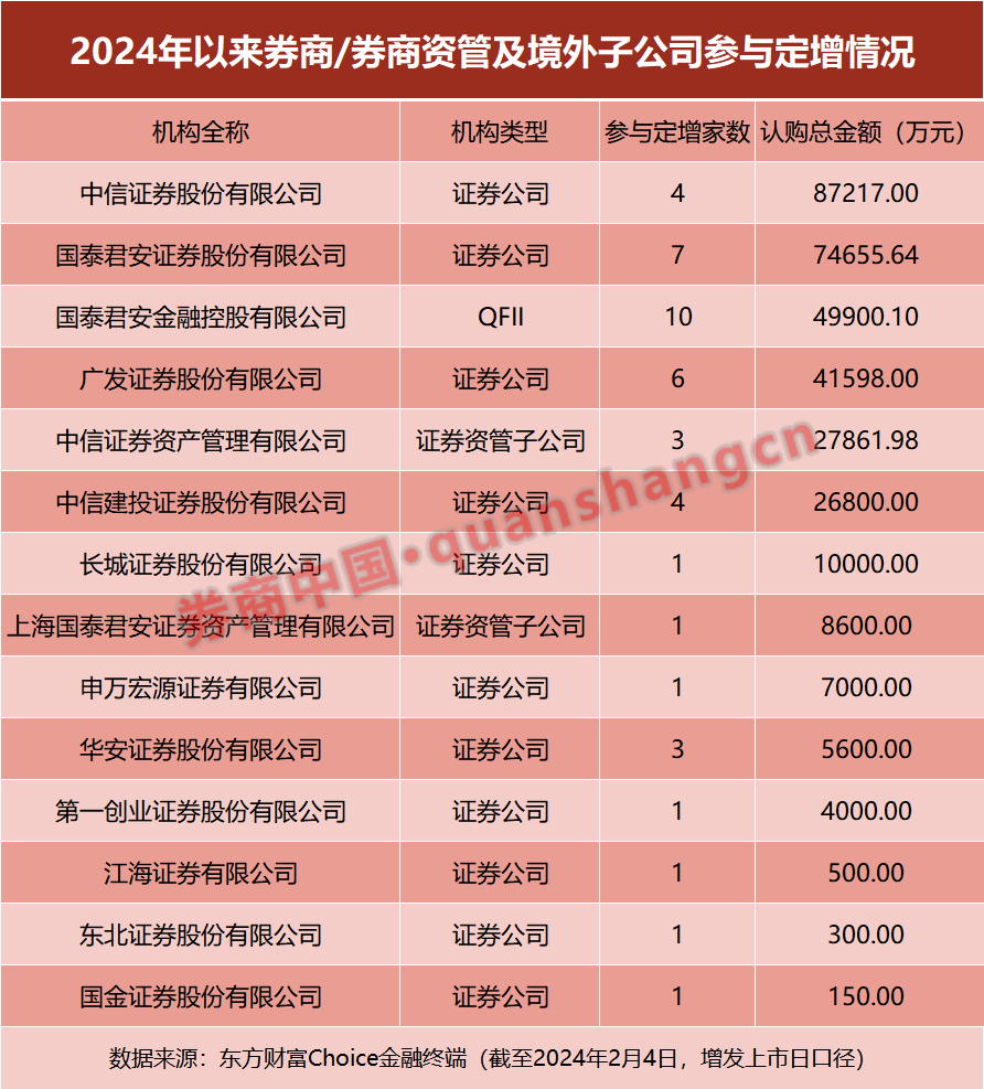 东方财富Choice数据显示,2024年以来,共有11家券商、2家券商资管子公司、1家券商境外子公司参与定增。