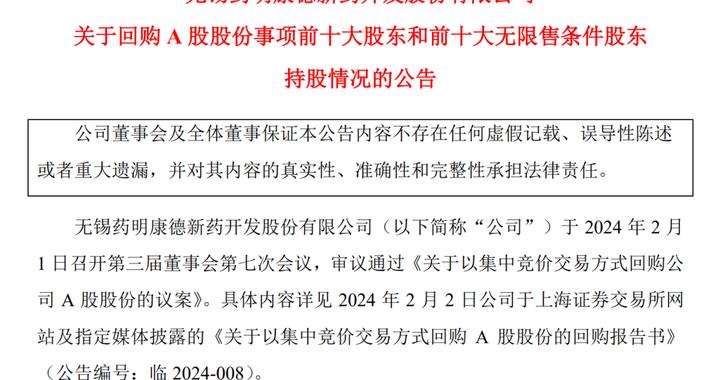 药明康德直言,本次总计回购A股股份2027.54万股,将暂存于公司股份回购专用账户中,并将按照相关规定及本次回购股份方案予以注销,后续将依法履行相关注销、减资程序和信息披露义务。