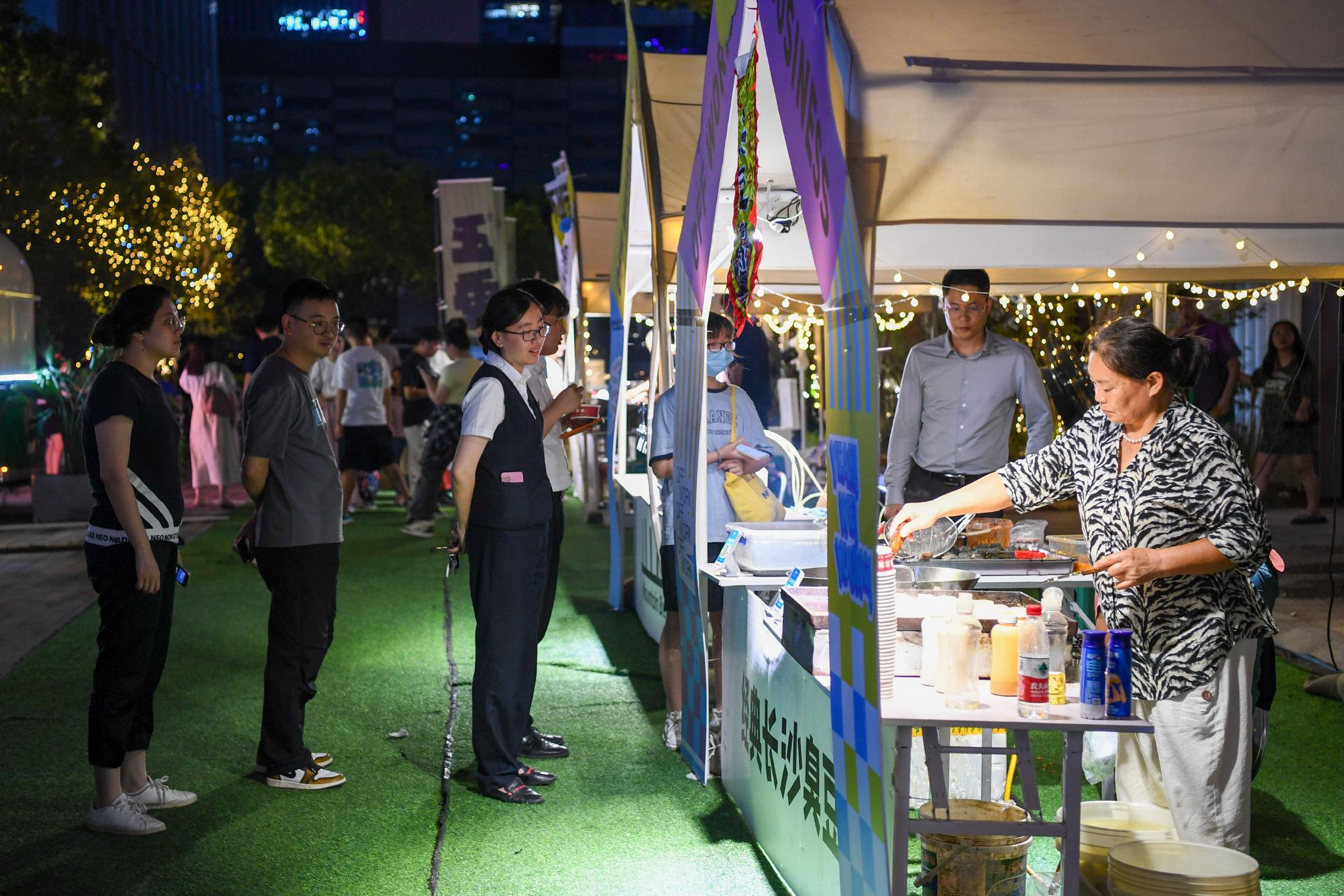 8月25日,市民和游客在南京市建邺区西城·夜未央街区排队购买小吃。新华社记者李博 摄