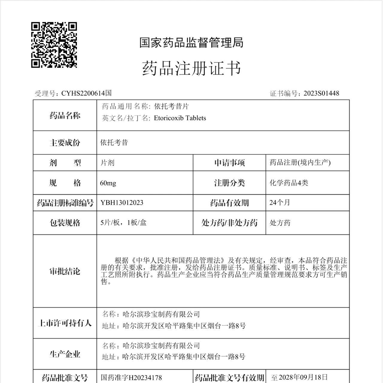 据了解,依托考昔片作为一种高选择性COX-2抑制剂。具有抗炎、镇痛和解热作用,适用于治疗骨关节炎急性期和慢性期的症状和体征,也可以治疗急性痛风性关节炎和原发性痛经。能够通过抑制COX-2,减少前列腺素和血栓素生成而发挥解热镇痛抗炎作用,具有起效快、镇痛强,半衰期长、胃肠道反应轻等优点。依托考昔的心血管安全性研究MEDAL试验证明,依托考昔组临床确诊的胃肠穿孔、溃疡、出血累计发生率显著低于双氯芬酸组(P<0.01)。胃肠道不良事件发生率比双氯芬酸钠降低50%。