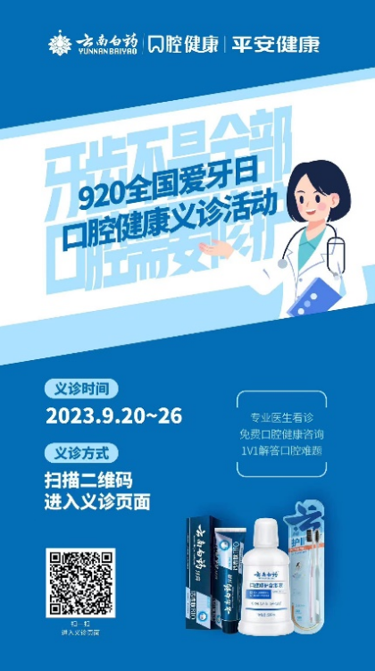 9 月 20 日,在全国爱牙日之际,平安健康联合云南白药口腔健康启动为期一周的口腔健康科普义诊活动。今年爱牙日主题为“口腔健康 全身健康”,为了让更多人关注口腔健康,本次活动将通过线上平台,由平安家医提供专业的口腔检查和诊疗建议,为 300 位民众提供免费的医疗服务和健康科普,解答口腔问题,提升健康意识。