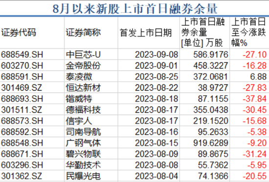 Wind数据显示,9月以来上市的14家上市公司中,上市首日有融券余量的仅有两家,分别是中巨芯-U(688549.SH)与金帝股份,占比14%。年初至今有257家上市公司挂牌上市,上市首日存在融券余量数据的仅有66家,占比25%。