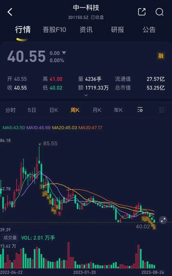 中一科技(301150.SZ)2022年4月IPO发行市值110亿,募资了27亿现金,如今只剩53亿市值,股价腰斩并创新低。
