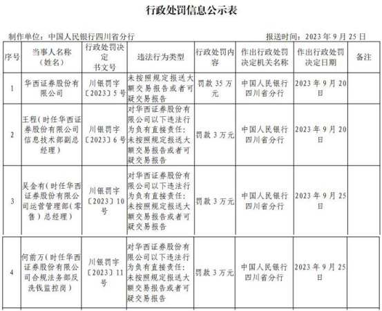 中国人民银行四川省分行对华西证券股份有限公司罚款35万元,对王程、吴金有、何前万各处罚款3万元。