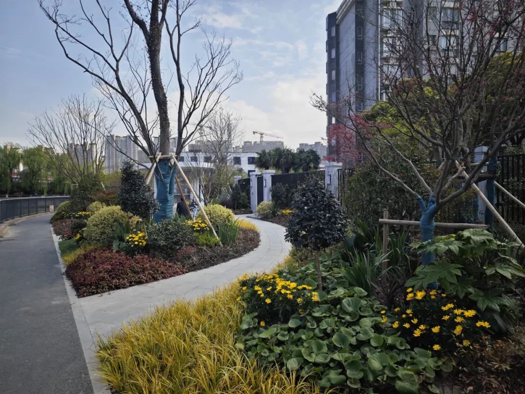 泾羽园的更新设计,实现了整体清晰结构、功能相对完善的“园”的重塑,让原本平平无奇的绿地具备了完整的“园”的结构,从传统绿地转为当代“口袋公园”,更好地融入水环绿色空间。园内的植物配置因地制宜,南侧现状开敞区域增补中层观花乔木,以“美人梅”为主景植物,重点打造春花园,搭配丛生朴树、红梅、茶梅等,结合冬花品种,营造12月至次年5月的观花体验;北部区域植物配置上结合原有大乔木,调整下层地被,配合艺术装置增加中层彩化植物,打造一个多彩、连续且充满活力的河畔空间。