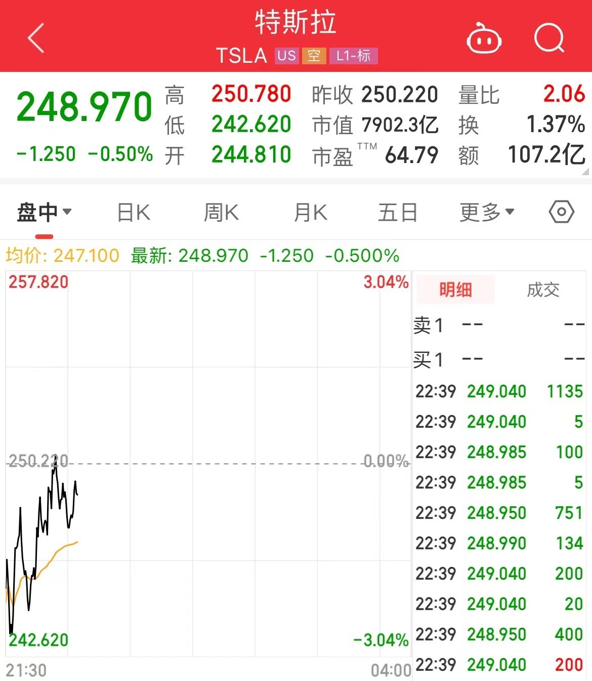 北京时间10月2日晚美股开盘,特斯拉股价一度跳水近3%,随后回升,截至发稿前下跌0.5%,最新市值7902.3亿美元(约合5.77万亿人民币)。