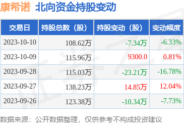 10月10日北向资金减持7.34万股康希诺。近5个交易日中,获北向资金减持的有3天,累计净减持25.11万股。近20个交易日中,获北向资金减持的有9天,累计净减持6.2万股。截至目前,北向资金持有康希诺108.62万股,占公司A股总股本的0.44%。