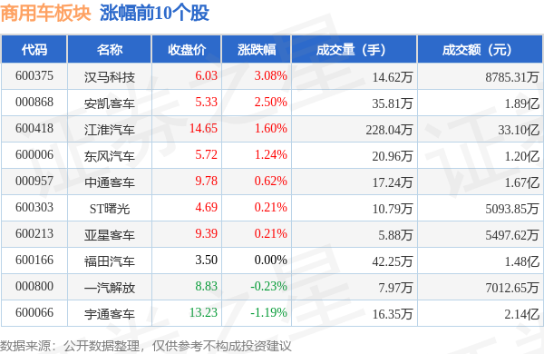 从资金流向上来看,当日商用车板块主力资金净流出3.61亿元,游资资金净流入1.42亿元,散户资金净流入2.19亿元。商用车板块个股资金流向见下表: