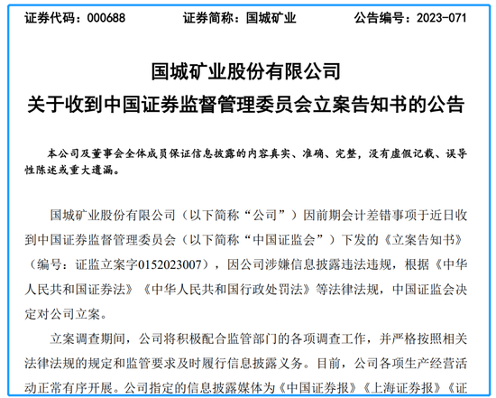 对于此次被立案调查,国城矿业表示,将积极配合监管部门的各项调查工作,并严格及时履行信披义务。目前,公司各项生产经营活动正常有序开展。