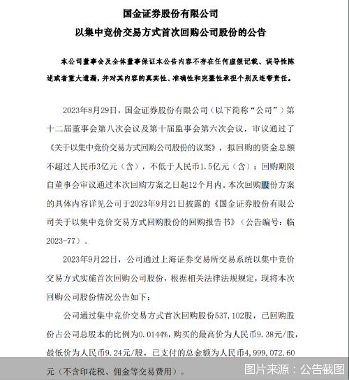 国金证券通过集中竞价交易方式首次回购股份53.71万股