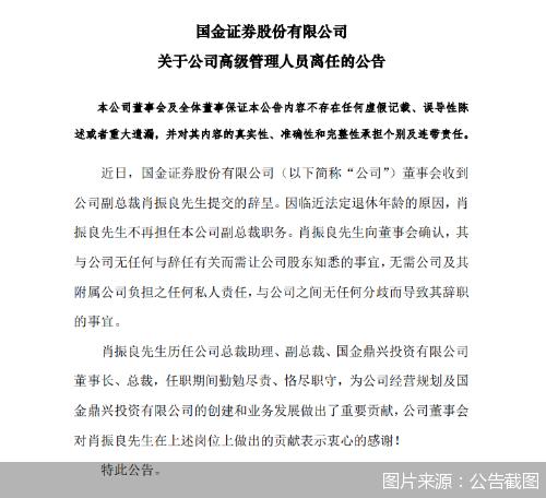国金证券:公司副总裁肖振良因临近法定退休年龄离任