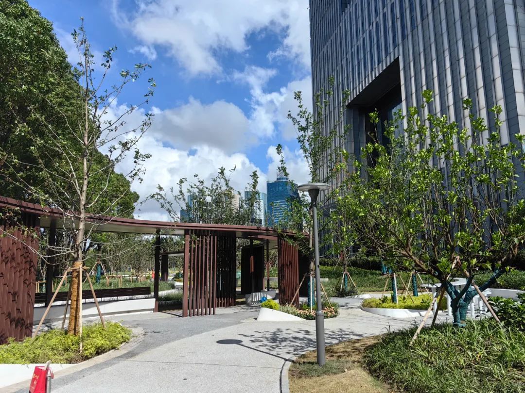 智慧花园位于上海金融交易广场南侧,总面积8000平方米,服务人群大多为商务人士,主题定位为“可聚集可闲坐,激活社交功能”的智慧商务花园。结合场地1.2米的竖向高差,智慧花园因地制宜打造了特色化的线性台地花园,并植入休憩设施,如景观廊架、休憩座椅、室外吧台等,打造一个可集聚、可社交、可休憩的共享客厅,让市民和白领们在紧张的工作生活中寻求一片放松和休闲娱乐的场所。