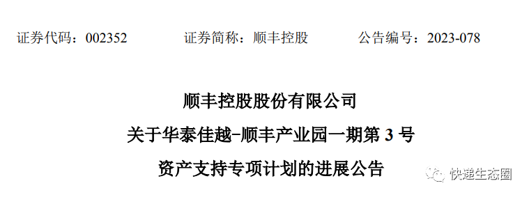 根据深圳证券交易所出具的《关于华泰资管“华泰佳越-顺丰产业园一期资 产支持专项计划”符合深交所挂牌条件的无异议函》(深证函 2018666号),2020 年 11 月 17 日,以深圳市丰泰电商产业园资产管理有限公司(以下简称“丰泰资 产”)为原始权益人的“华泰佳越-顺丰产业园一期第3号资产支持专项计划” (以下简称“专项计划”)正式成立,募集资金总规模为人民币 13.86 亿元,每三年延展运作一次。公司子公司深圳顺丰泰森控股(集团)有限公司(以下简称 “顺丰泰森”)为优先收购权人,在专项计划产品到期、延展运作进入处置期或提前终止时,可通过自己或指定主体行使物流产业园资产的优先收购权。