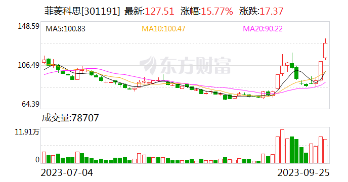 菲菱科思股价创出历史新高,截至13:29,该股上涨19.67%,股价报131.80元,成交量760.97万股,成交金额8.93亿元,换手率34.91%,最新A股总市值达91.39亿元,A股流通市值28.73亿元。