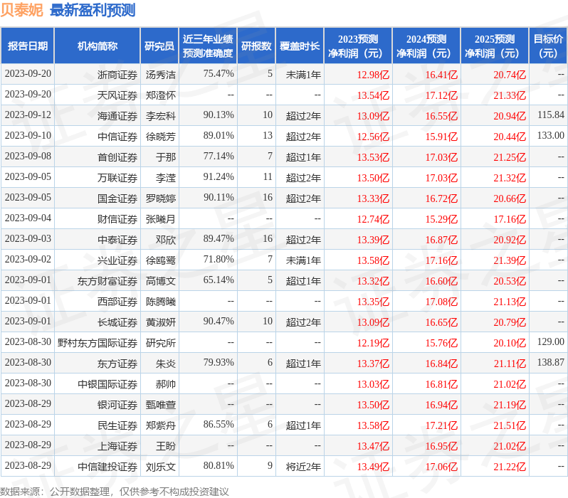 证券之星中心根据近三年发布的数据计算,万联证券李滢研究员团队对该股研究较为深入,近三年预测准确度均值高达91.24%,其预测2023年度归属净利润为盈利13.5亿,根据现价换算的预测PE为29.28。