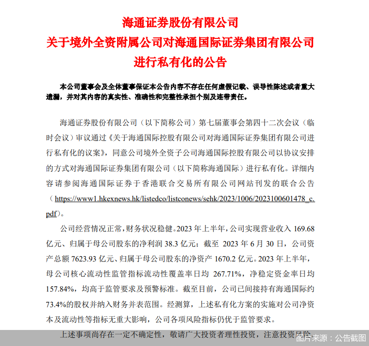 同时,海通证券指出,截至目前,海通证券已间接持有海通国际约73.4%的股权并纳入财务并表范围。经测算,上述私有化方案的实施对公司净资本及流动性等指标无重大影响,公司各项风险指标仍优于监管要求,上述事项尚存在一定不确定性。