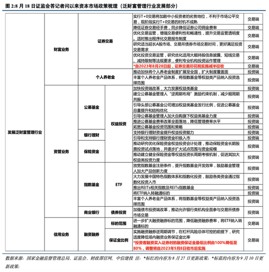 投资端角度,一方面,长期资金的引入是资本市场慢牛、长牛的基础,资本市场的活跃离不开长期资金面的有力支持,但相较海外,国内资本市场中长期资金力量不足;另一方面,房住不炒、资管新规以来,国内财富管理行业卖方销售模式和投资者尚未转变的刚兑预期带来“金融产品赚钱而投资者不赚钱”的核心痛点,上述两者一定程度上阻碍了国内资本市场的发展和其所带来红利的分配。针对上述阻点,监管2019年推动基金投顾试点、2022年个人个人养老金实施办法出台、2023年基金投顾管理规定征求意见稿发布,2023年8月18日证监会提出如引导长期资金长期入市、推动理财等增量资金入市、大力发展权益基金、发展指数基金、鼓励券商衍生品业务创新,适度放宽风险指标等一系列措施。