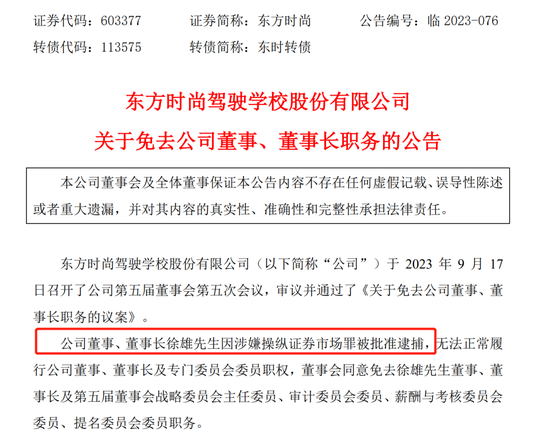9月17日晚间,东方时尚(603377)公告称,公司董事、董事长徐雄因涉嫌操纵证券市场罪被批准逮捕,无法正常履行公司董事、董事长及专门委员会委员职权,董事会同意免去徐雄董事、董事长及第五届董事会战略委员会主任委员、审计委员会委员、薪酬与考核委员会委员、提名委员会委员职务。东方时尚董事会同意推举东方时尚创始人之一、公司董事、总经理闫文辉代为履行董事长职责。