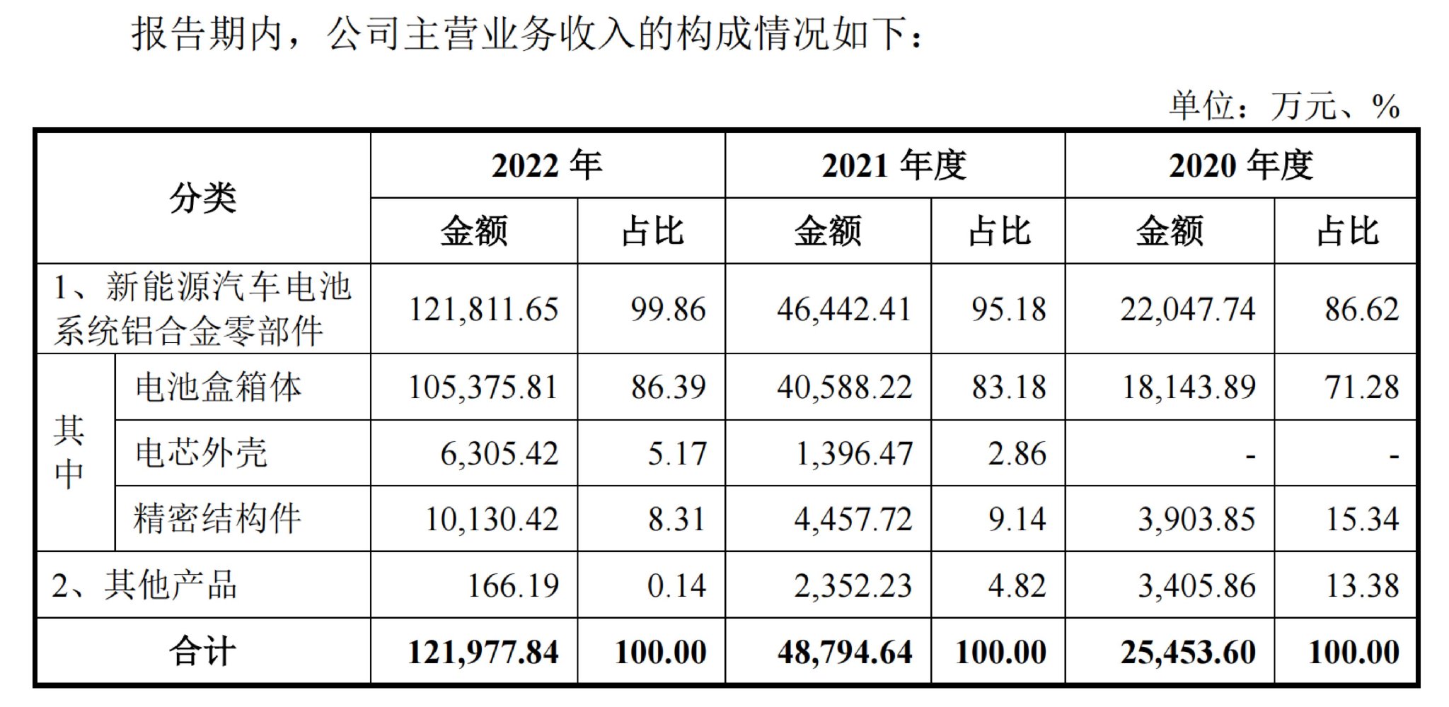 2020年到2022年,新铝时代主要收入来源于与比亚迪的合作,来自比亚迪的营业收入占比分别为64.80%、70.42%和78.87%,发行人对比亚迪构成重大依赖。招股书称,现阶段,虽然下游少数新能源汽车厂商存在自建电池盒箱体产线的情况,但行业内仍以第三方外部电池盒厂商供应为主。